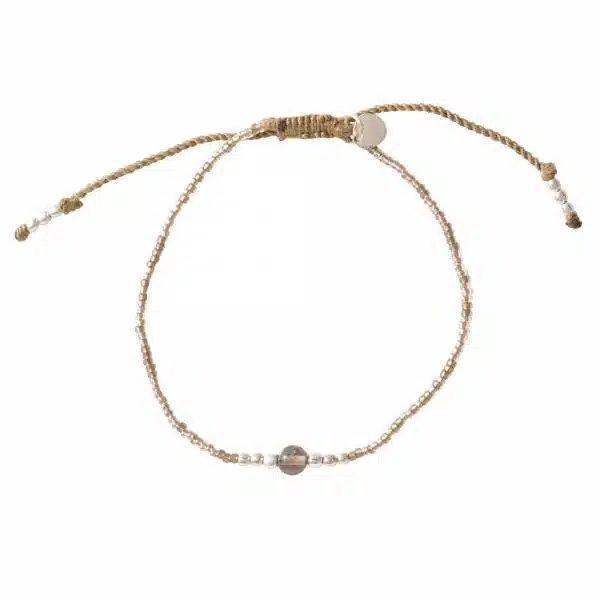 • Deze armband van glaskralen, messing kralen en een kleine rookkwarts edelsteen is geregen op draad. Het schuifslot is van katoendraad.