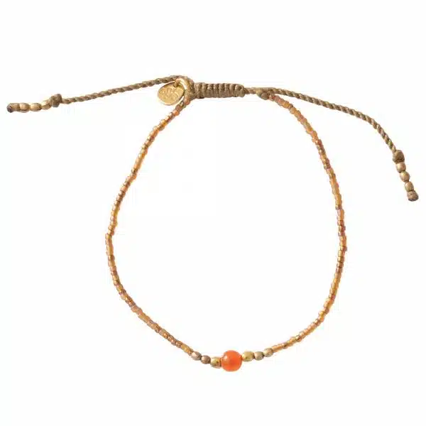 - Deze armband van glaskralen, messing kralen en een kleine carneool edelsteen is geregen op draad. Het schuifslot is van katoendraad.