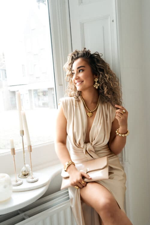 Alle modellen dragen geen bh onder deze jurk. Toch liever een bh? Dat kan! Maak de jurk dan wat hoger dicht met een drukknoopje of speldje ; dit zie je niet! Of wat dacht je van een mooie broche?