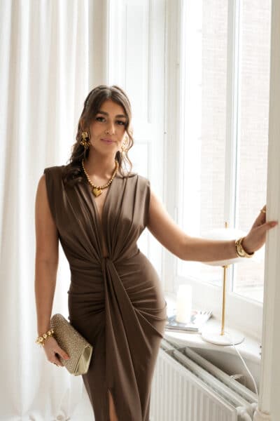 Alle modellen dragen geen bh onder deze jurk. Toch liever een bh? Dat kan! Maak de jurk dan wat hoger dicht met een drukknoopje of speldje ; dit zie je niet! Of wat dacht je van een mooie broche?