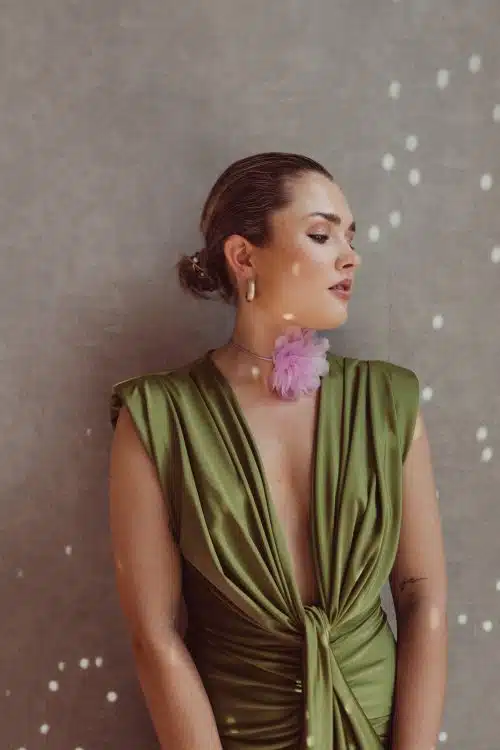 Alle modellen dragen geen bh onder deze jurk. Toch liever een bh? Dat kan! Maak de jurk dan wat hoger dicht met een drukknoopje of speldje ; dit zie je niet!