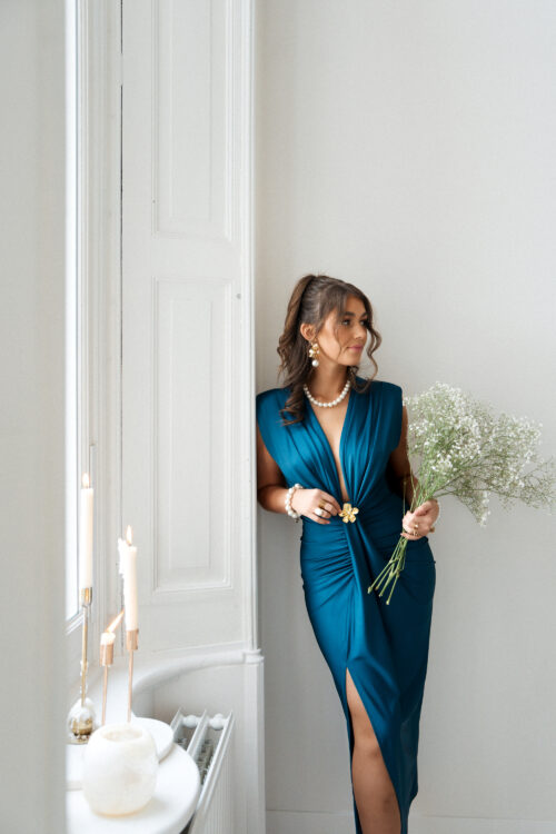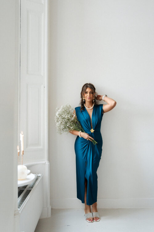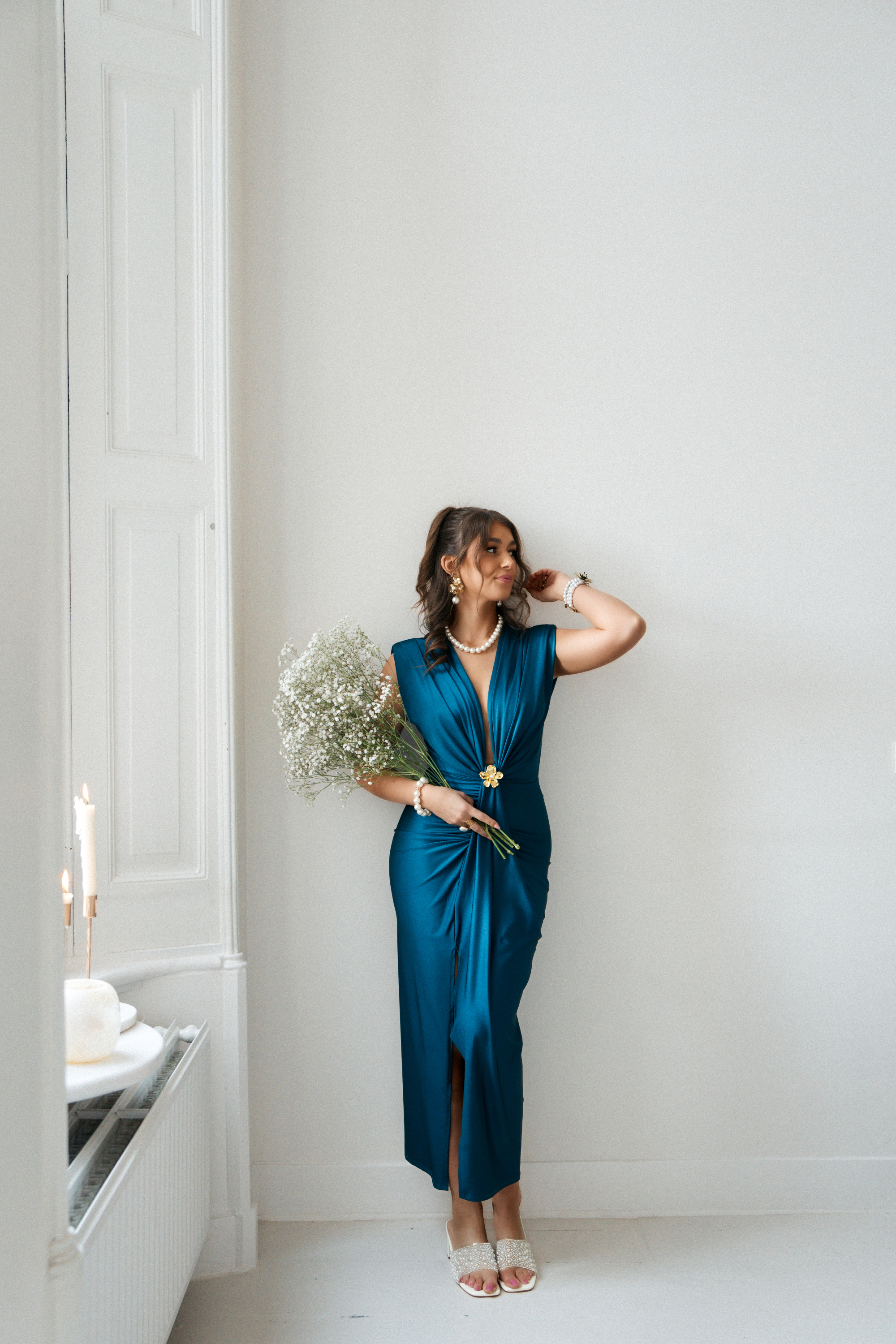Alle modellen dragen geen bh onder deze jurk. Toch liever een bh? Dat kan! Maak de jurk dan wat hoger dicht met een drukknoopje of speldje ; dit zie je niet! Of wat dacht je van een mooie broche?