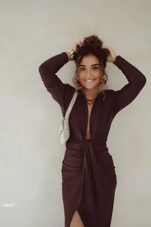 Alle modellen dragen geen bh onder deze jurk. Toch liever een bh? Dat kan! Maak de jurk dan wat hoger dicht met een drukknoopje of speldje ; dit zie je niet!