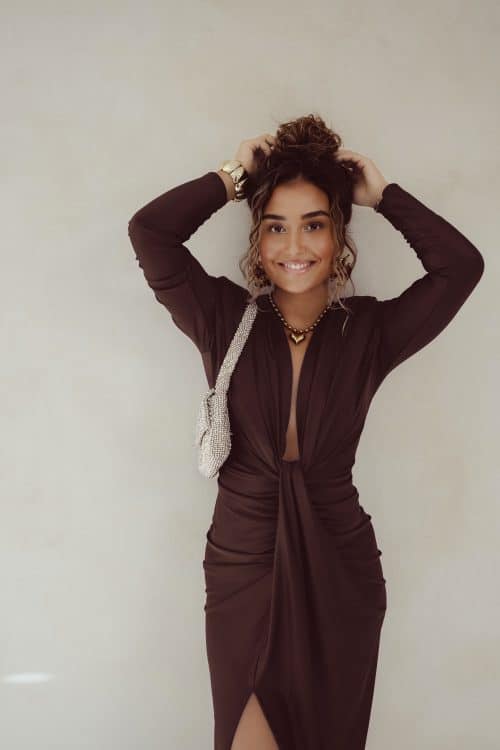 Alle modellen dragen geen bh onder deze jurk. Toch liever een bh? Dat kan! Maak de jurk dan wat hoger dicht met een drukknoopje of speldje ; dit zie je niet!