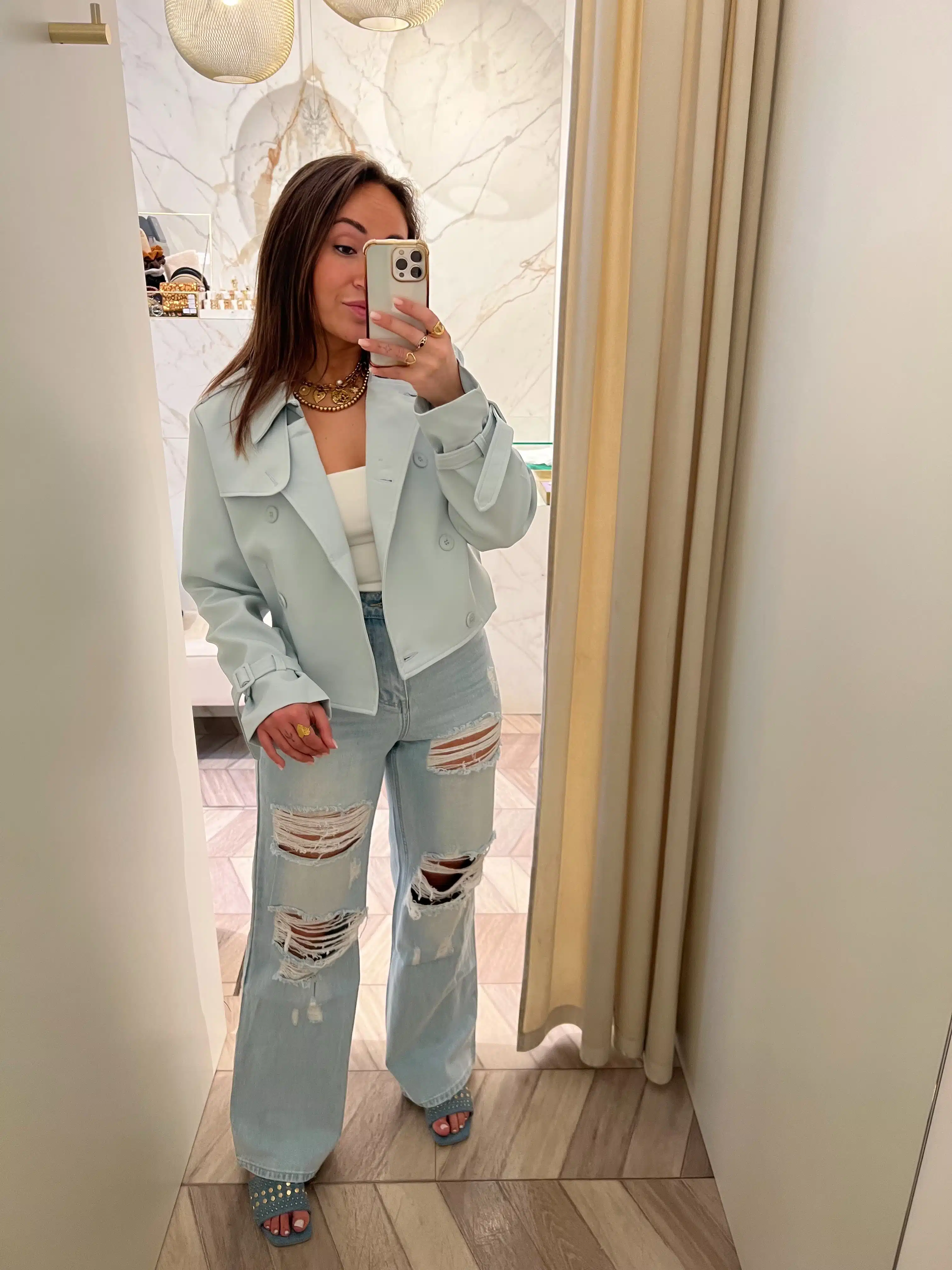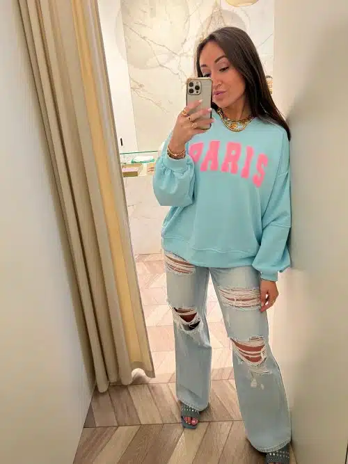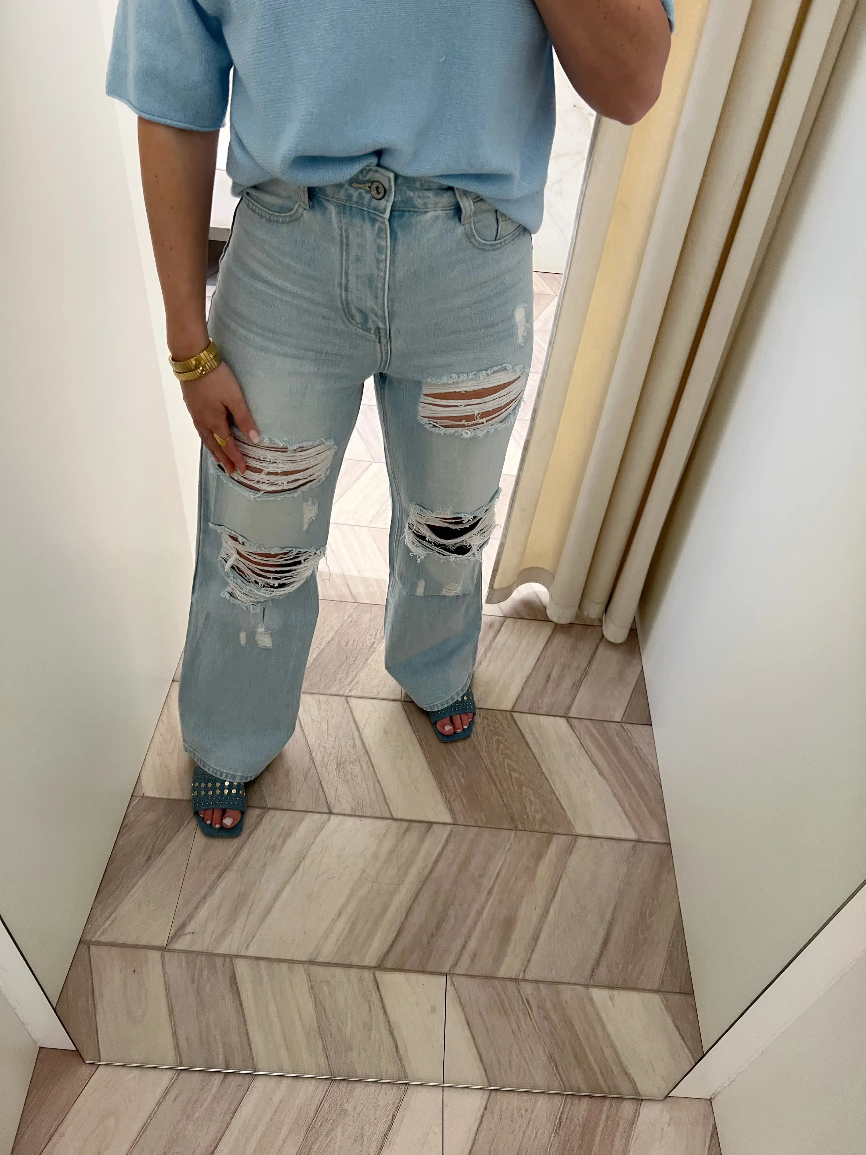 - model draagt normaal 34/36 en heeft op de foto 36 aan. Deze zat heel strak en ze zou zelf liever een 38 nemen.
